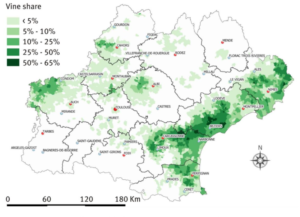 Figure 2. Concentration of vineyard land in Occitanie, as a percentage (DRAAF Occitanie, IGN BD Carto, Customs CVI 2018)