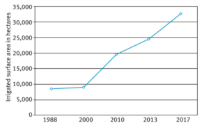 Figure 4. Number of irrigated wine-growing areas in Languedoc-Roussillon, in hectares (RGA 1988, 2000, 2010, Agreste 2013, AIRMF 2017)